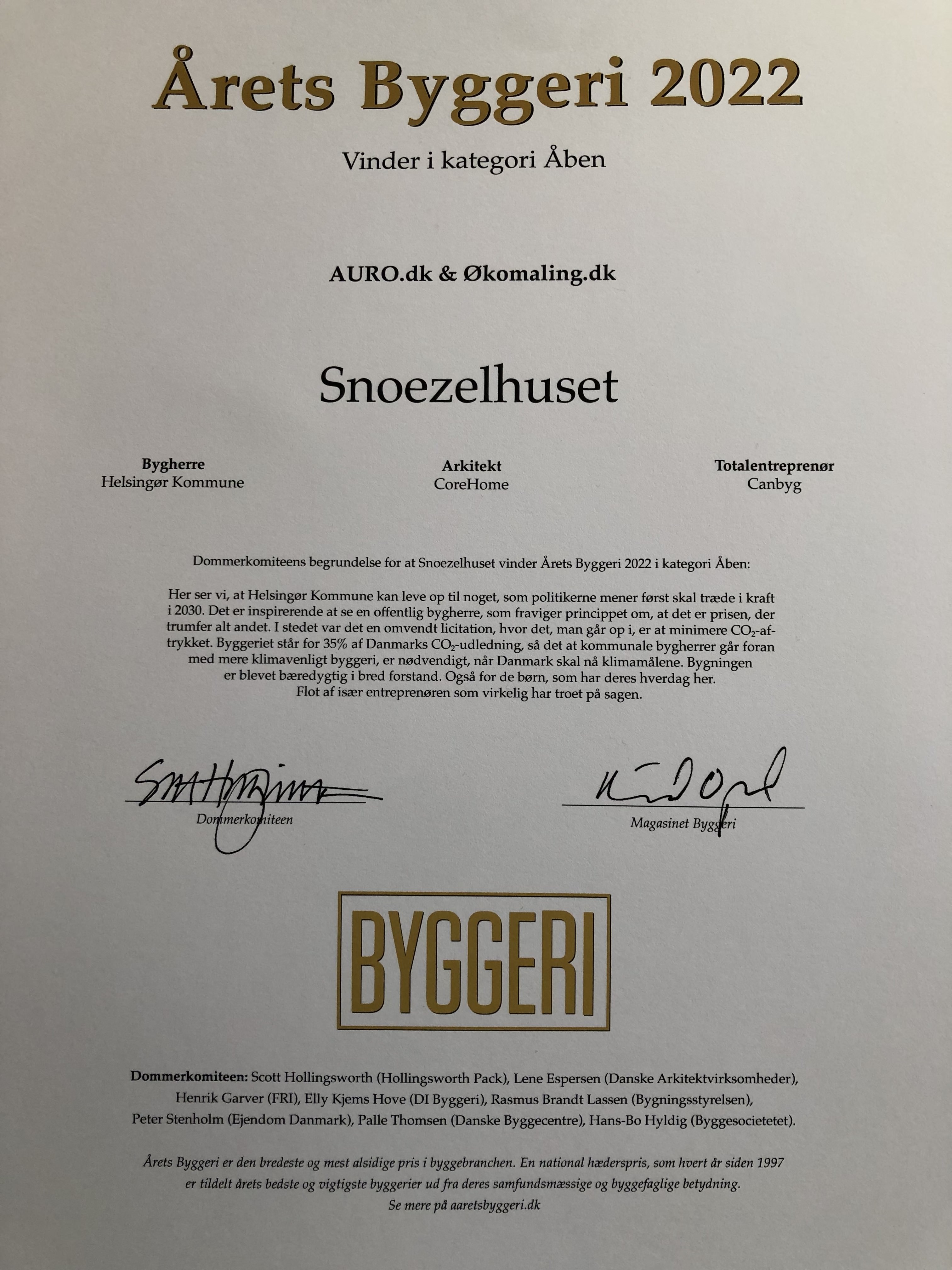 Tak til Helsingør Kommune for at sætte fokus på bæredygtighed og sundt indeklima. Og tak til XL Byg Knud Larsen Professionel i Roskilde samt Canbyg for at invitere økologisk AURO kalkspartel, Ecolith Inde Kalk, Premium-Vægmaling, Silkemat Maling til panelerne og udendørs træbeskyttelse med i projektet på fladerne inde og ude. Derudover selvfølgelig et stort tak til dommerkomiteen bag kåringen for at belønne de kræfter, der arbejder med tidens nødvendige bæredygtige løsninger til byggeriet, der her i 2022 både står for intet mindre end ca. 40% af CO2-emissionerne til atmosfæren og 40% af verdens samlede affald.
